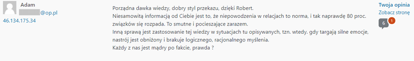 Skorzystaj z doświadczenia Roberta Marchela, który od 2008 roku doradza klientom jak budować trwałe i szczęśliwe związki. Jest twórcą wielu kursów online na temat relacji damsko - męskich, regularnie występuje w radio i w telewizji (DDTVN, Pytanie na śniadanie) oraz na uniwersytetach w Polsce i na świecie. Jego kanał subskrybuje ponad 150 000 osób. Aktualnie prowadzi badania naukowe na temat mechanizmów w relacjach damsko - męskich.