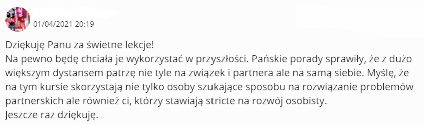 Być może Twój partner nie wywiązuje się z obowiązków domowych, ma złe nawyki, uzależnienia albo swoim zachowaniem pokazuje, że kompletnie nie liczy się z Twoimi potrzebami. Jeśli tak to czujesz, to koniecznie musisz zdobyć wiedzę z kursu, aby naprawić ten niedziałający element Waszego związku.